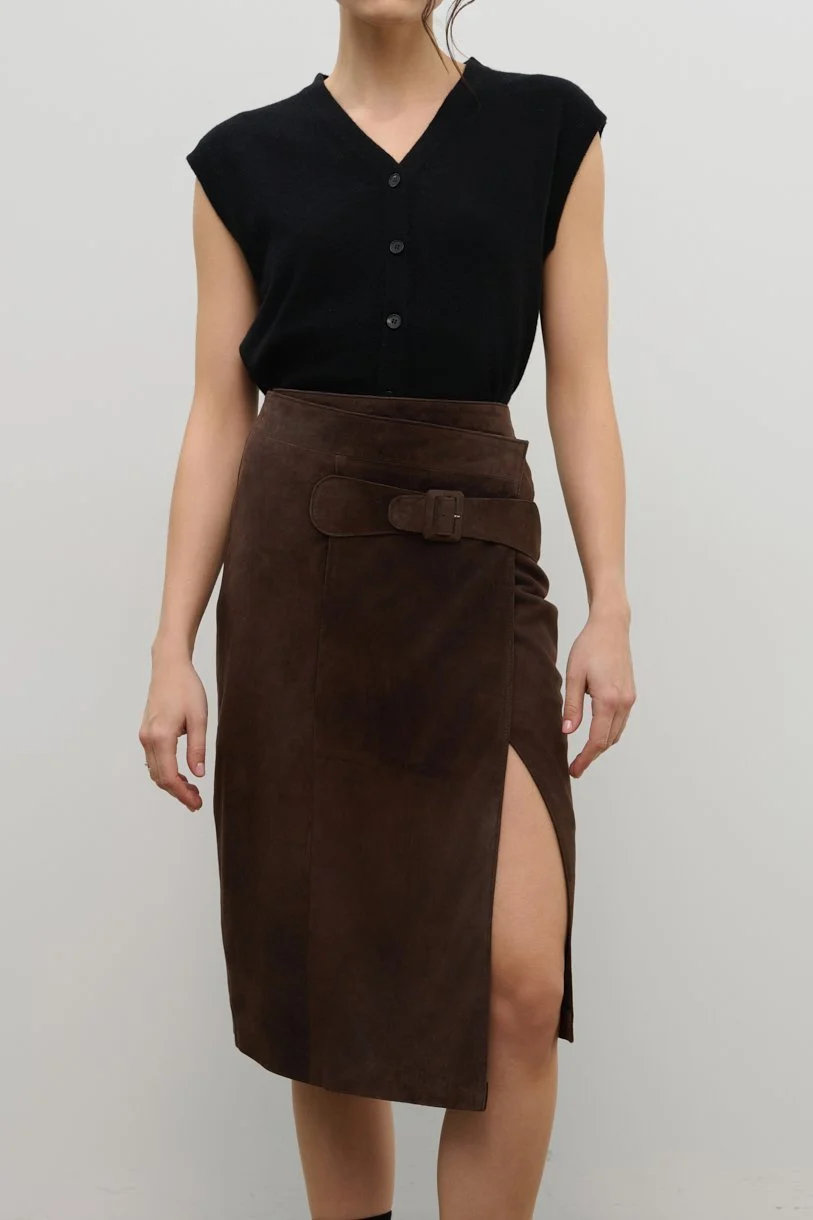 Ready to Wear › The Asymmetric Midi Skirt in Espresso Suede Image 1 of 5 Image 2 of 5 Image 3 of 5 Image 4 of 5 Image 5 of 5 The Asymmetric Midi Skirt in Espresso Suede £450.00 sold out Calf-length asymmetric pencil skirt in soft lamb suede with belt detail and side slit, lined with 100% silk Sold Out Added! Calf-length asymmetric pencil skirt in soft lamb suede with belt detail and side slit, lined with 100% silk